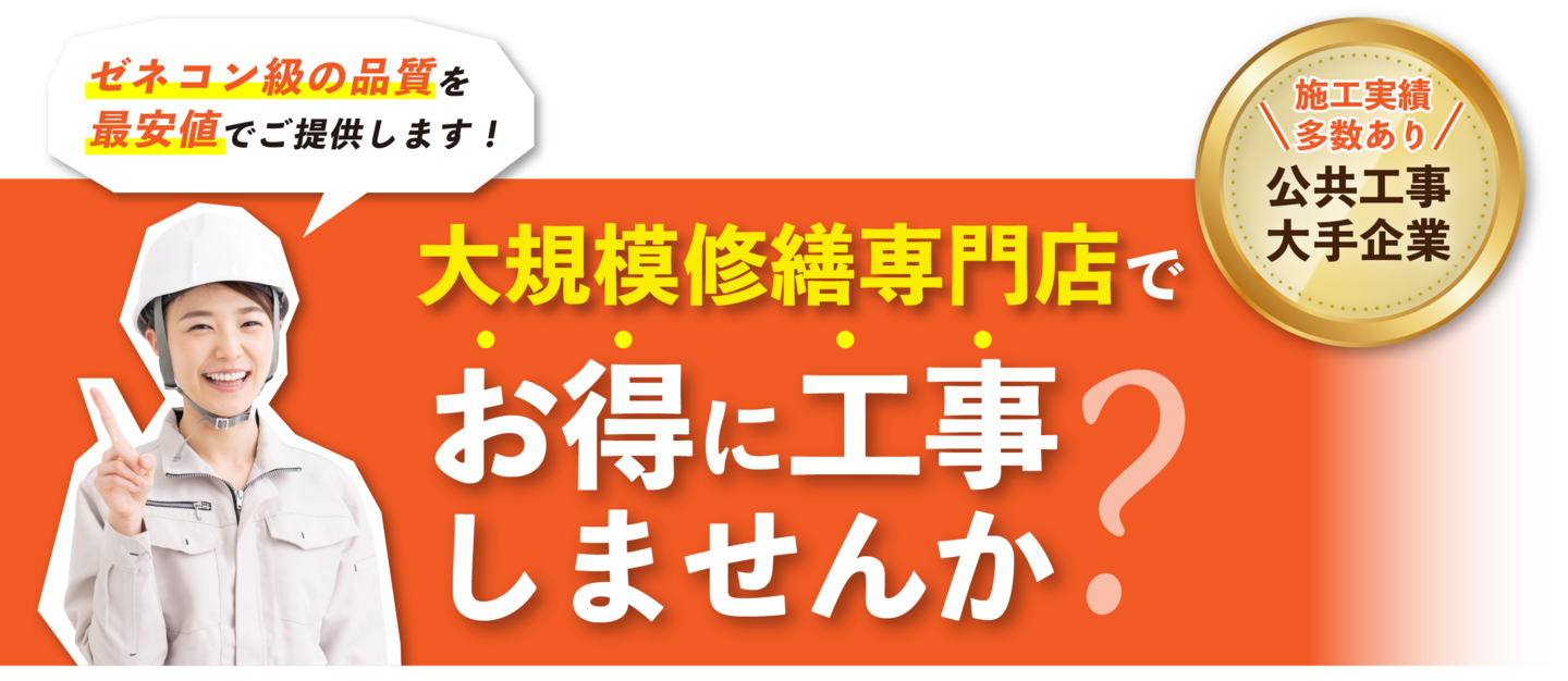 当社はお客様から元請けで受注し、専属職人が直接施工するため中間マージンが発生しません。公共工事やゼネコンでの工事経験もある技術力の高い熟練の職人が在籍し、高品質な工事を低価格でご提供できます。